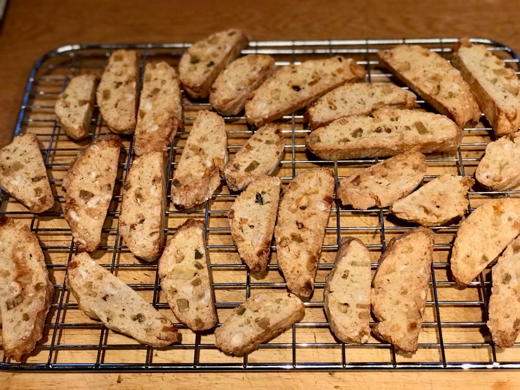 Made the mix up according to the recipe which involved whizzing a few nuts into a fine powder to add to the flour and baked the mixture into two long sausages, allowed them to cool and then with a serrated knife cut on the angle and baked again.