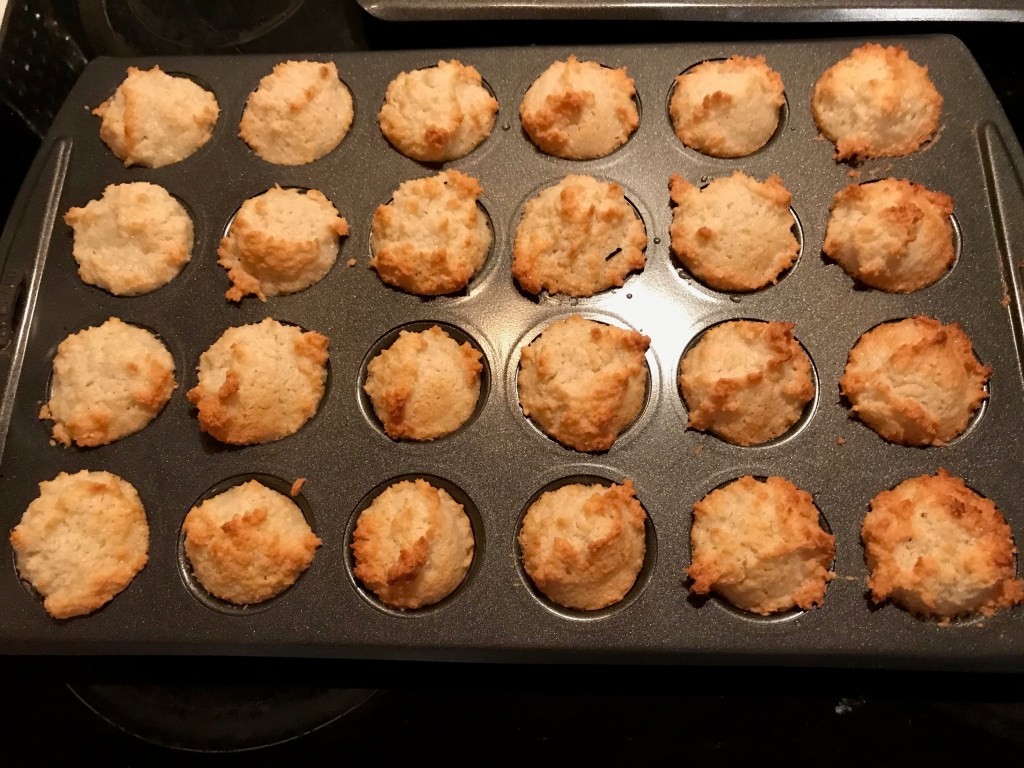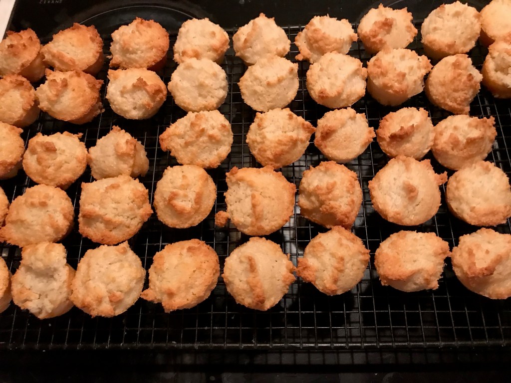 And lastly we bake treats. The last of the desiccated coconut and ground almonds made these delicious little macaroons. Most of them are in the freezer to be dished out very occasionally. They were a good way of using up some egg whites that I had left over from making a custard to make a vanilla and blackcurrant ripple ice cream, which was really very good and worthy of our home grown blackcurrants.