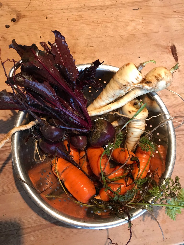 We quite like kale, carrot, tomato, orange juice and chestnuts from Crackly Woods all whizzed together with a big dollop of local honey. It goes down well as a second breakfast! We have nearly finished the rainbow chard, so I will have to let that recover, but it has been splendid in stir fries as has the kale and we are waiting for a second flush of purple sprouting. We have about five small cabbages left, which is good as it is one of Dad’s favourites and 3 large pumpkins left in store.