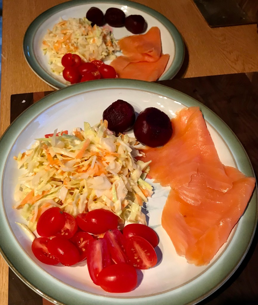 Our fridge continues to do a fantastic job, but we really are at the end of fresh tomatoes, we have a few carrots left, lots of onions, sack of potatoes and the allotment. We also have a good selection of meat and vegetables in tins and the freezer from my Brexit stash, so all is not lost. So to cheer us up we rescued the smoked salmon out of the freezer to make us a cheering lunch with home made coleslaw from our own cabbage and a little beetroot which we ate with a slice of homemade bread.