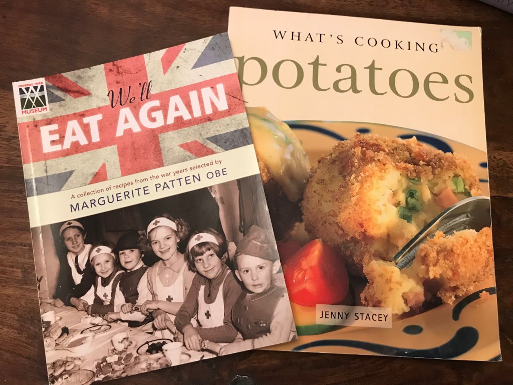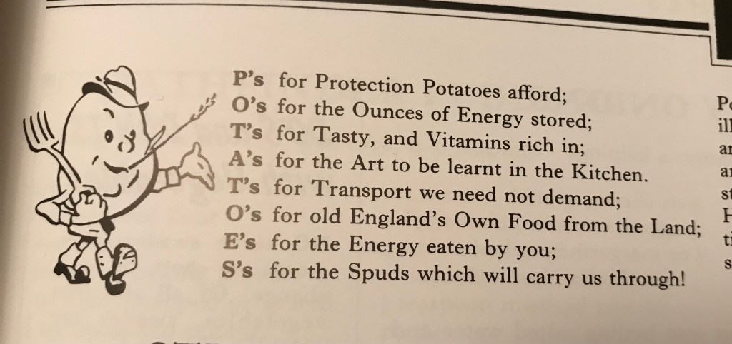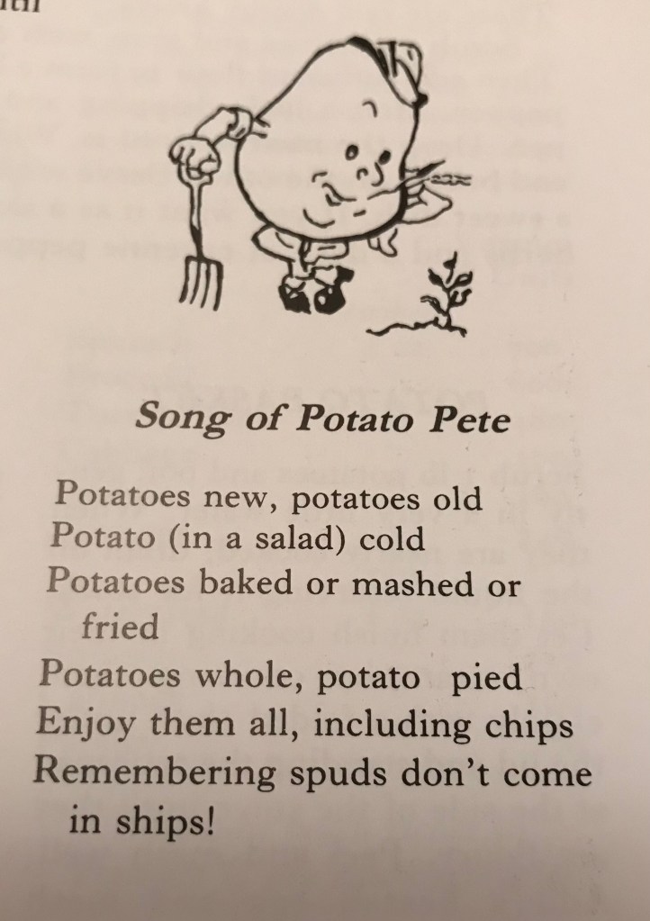 I decided to have a look through my cookery bookcase and found these two beauties. Are we not fortunate to live in a country that the potato is a staple of our diet. There is just so much one can do with it and I feel it is so much more nutritious than wheat or rice and I think far tastier. These two books have given me fresh inspiration for our suppers, but it is the humour of Potato Pete and other little ditties that have given me the most pleasure. I shall share some with you. Until the next time, stay safe.