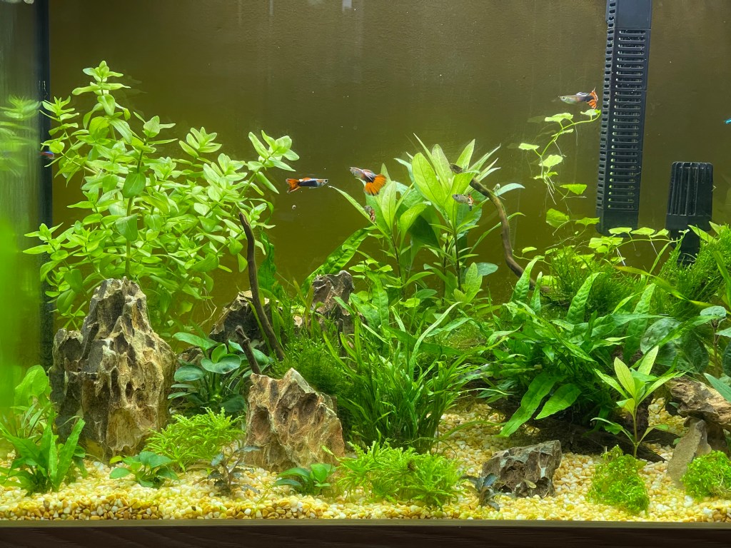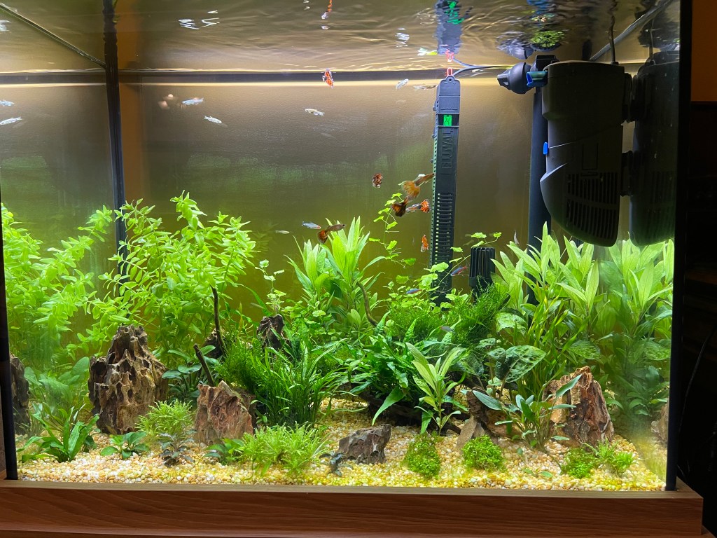 Continue to add more plants, start adding C02 and plant food regime along with investing in lights for plants, add dragon stone and red moor root that has been soaking for weeks to remove the tannins. Test water daily and keep up with the water changes. One memorable day we did have a spike, we have since learned it was nothing to worry about, but we did a 50% water change twice, back to back. Nightmare! Took hours.