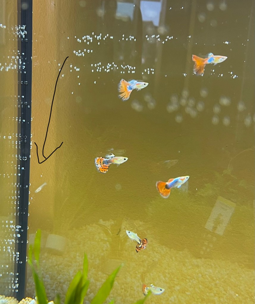 Dose with a few hardy fish, guppies are a good choice. Some people do fishless cycles, adding ammonia and bacteria to cycle their tank, but this is a big tank and we will have fair warning of any ammonia, nitrite, nitrate spikes. Note the tiny spry that accidentally came with the male guppies, we successfully grew her on, she turned out to be a female guppy ‘Quelle horreur” and was carefully returned last week, I do not want a tank full of babies.