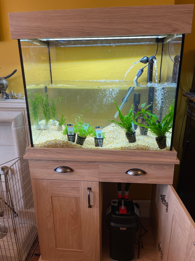 First set up tank on a firm base and strong floor, water is surprisingly heavy, this set up weighs well over 24 stone. Next put in substrate and slowly fill tank over 24 hours, you don’t want to fill a tank and find out it leaks like a sieve. Then leave to settle with pump going and start to dose with add water conditioner and dose with bacteria daily.