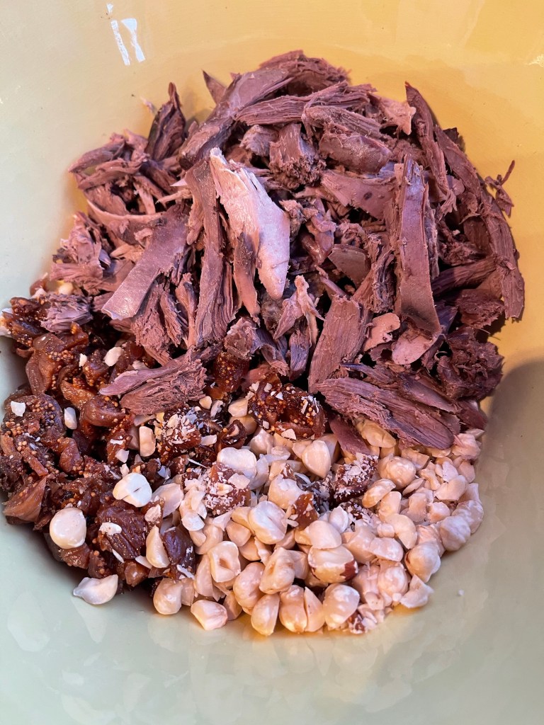 After poaching the pigeons in the aromatics I removed the flesh, and roughly chopped along with the hazelnuts.