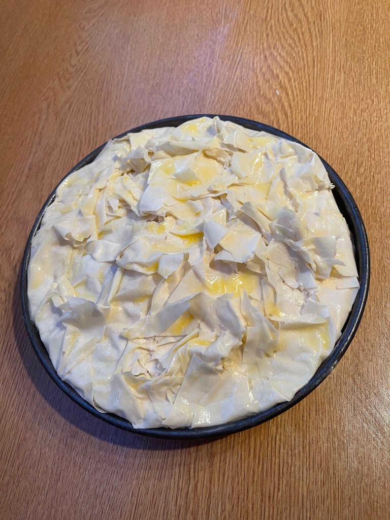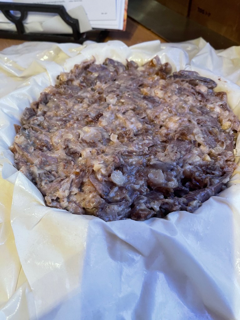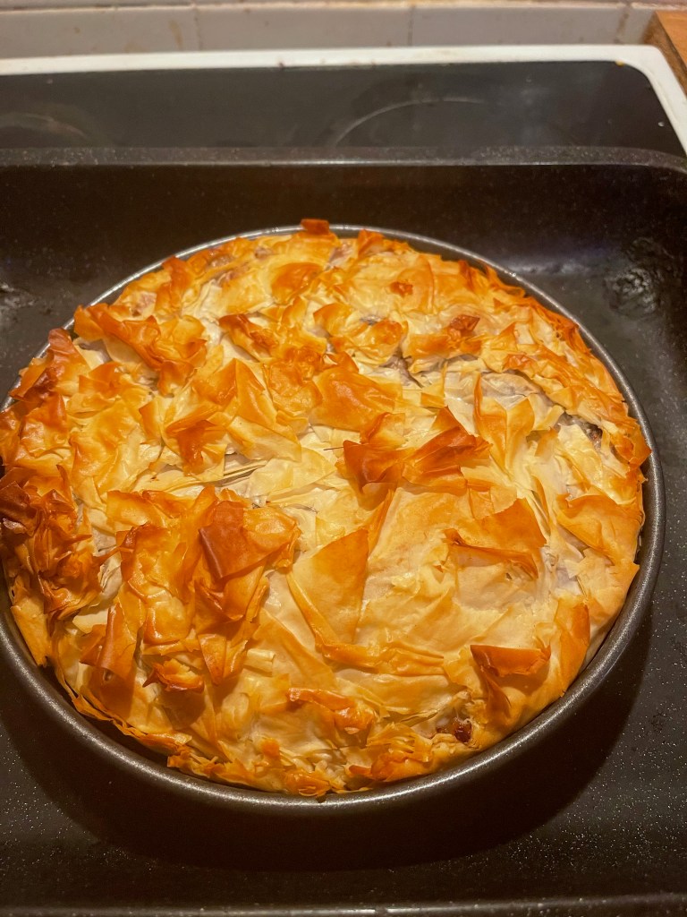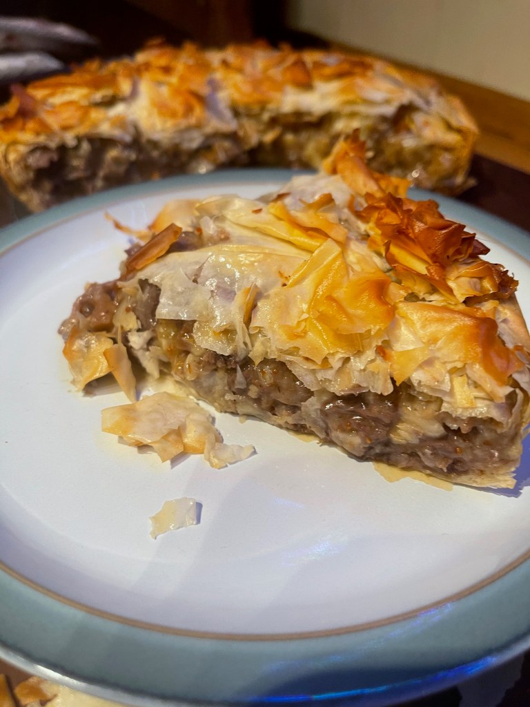 And this is where the recipe falls down. Firstly no seasoning is mentioned, So I seasoned lightly, I wished i’d added more salt and black pepper. But the biggest problem was the hazelnuts, I wish I’d roasted them before adding them. Every mouthful the flavour of raw hazelnuts took over. It was very disappointing with the effort that had gone into the pie. Nowhere in the recipe does it say they should be roasted and I think it is almost an unforgivable oversight to ruin such an expensive dish. Very disappointing. If you happen to like the flavour of raw hazelnuts, then maybe this dish is for you. Would I try this dish again? Yes, if I came upon a surplus of pigeons but there are other Pastilla recipes with a sweet egg formulation in the filling that call to me to try first. Maybe hubby’s next birthday!