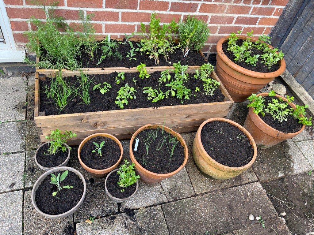 We have ten herbs here, some soft which will need replacing next year and some hardy, all apart from the rosemary plants whose seed failed grown by me. Rosemary, Basil, Coriander, Spearmint, Sage, Parsley, Chives, Garlic Chives, Dill and Thyme. I used Budget Seeds for my herb bed adventure. I have always felt it quite ridiculous to buy herb seeds that have 400 or a 1000 for well over the £2.00 per packet, I am not going into business, selling herb plants! So when I came upon this company I was very pleased. Mostly they are 29p a packet, so this whole venture, combined with old terracotta pots, two wooden planters from an Amazon find and some compost has not cost much money. I will definitely be looking through their stock again for next year.