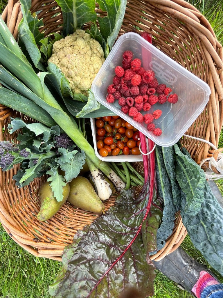 One of the cauliflowers that did good, some black italian kale, some rainbow chard, the last of the french beans, the rest being left to go to seed to provide dried haricot beans in the winter, the first of the purple sprouting and the first of the leeks. Pears which are having trouble ripening this year so far and may well be poached with a raspberry sauce. Oh and of course tomatoes and I’m sure I could find a cucumber if I wanted to.