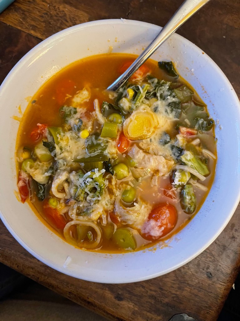 So I made minestrone which is one of my favourite soups and is so versatile to make with whatever is good in the garden as long as you have tomatoes, onions or leeks, a root in the way of a carrot, some leaves, a pulse and some pasta and good stock. Starting slowly with a gentle saute of the onions/leeks and roots to bring out the sweetness and flavour and then you can add pretty much anything, I throw in sweetcorn and diced courgettes and french beans and any vegetables that look good, even a little potato has been known to be added to the delicious bubbling pot. That with a good grating of parmesan and I’m a happy girl.