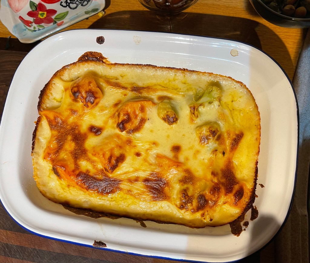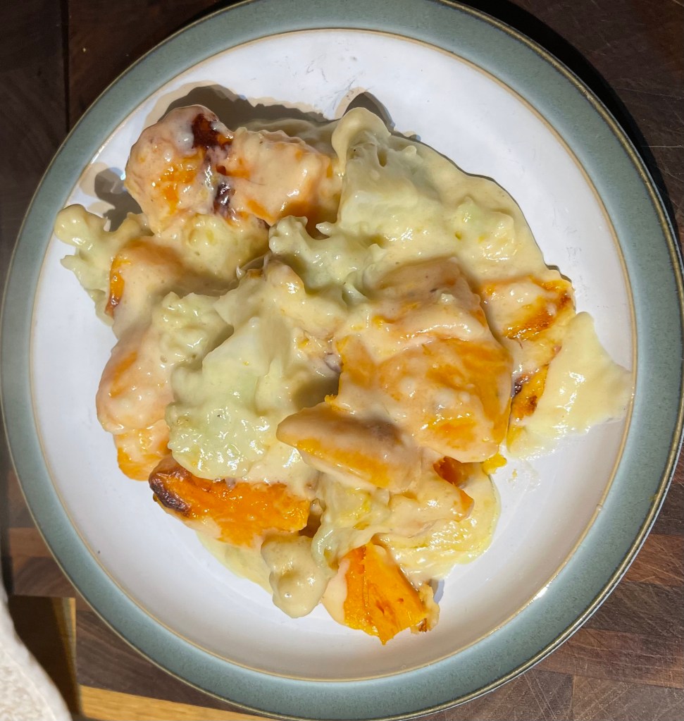 Then try as I might to steer the culinary conversation away from cheese – I’m trying to up my plants and cut back on my cheese and meats – that little cauliflower cried out for a cheese sauce. So I marched to the corner shop and came back with cheese and milk and as a side note that little culinary shopping trip came to nearly seven pounds on two items! £4.00 for 300g cheese and £2.67 for the milk. I think I will be doing the longer walk to the supermarket in the future. But I made a delightful cauliflower cheese with an added addition of some sweet potato to make it a little more substantial. It was everything I wanted it to be.